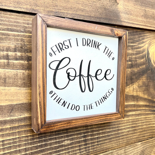 First I drink the coffee then I do the things wood sign, Coffee Corner Decor, Framed wood Sign.